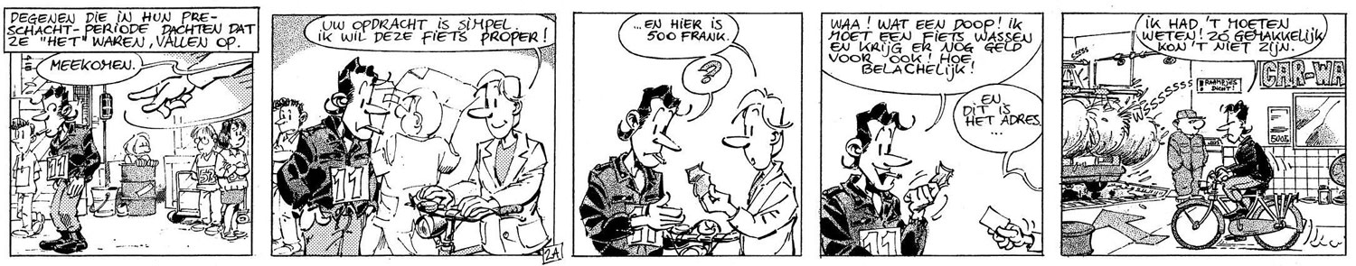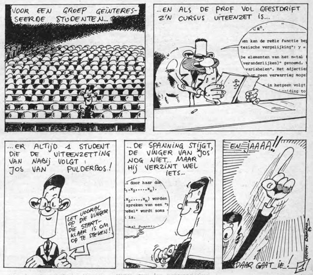 Between 31 October and 13 December 1984, Dierickx drew a weekly comic strip for the student magazine Veto, which circulates in the university city Leuven. The story follows an enthusiastic student, Jos van Pulderbos, who tries to make it on the college campus. Although brilliant, he is less lucky with women. Dierickx also drew regular cartoons for Veto, which he signed with his initials, E.D., AKA Ed. Two other future notable people who wrote and illustrated for this student magazine around the same time were Pascal Lefèvre and Katrien van Schuylenbergh. Dierickx also contributed to other student magazines like Studentikoos, Student Echos and De Voetbalgazet, published by Eric Dilles.