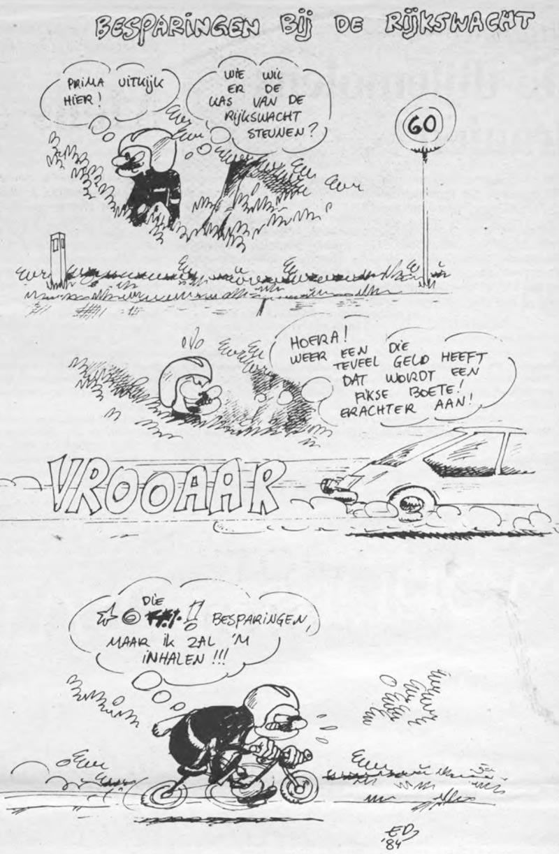 From: Veto (15 November 1984). Cartoon about financial cuts at the gendarmerie.