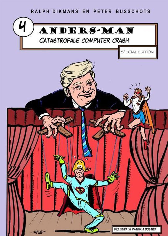 Around 2015, Dikmans picked up cartooning himself to blow off steam from his daytime job in the special education system. He developed the not too fearsome 'Anders-Man' ("Different-Man"), and began showing his artwork at comic festivals and other events. Belgian publisher Catherine Dejonghe was interested and gave Dikmans the opportunity to release his first album through her non-profit organization 't Mannekesblad. Within a couple of months, the cartoonist cranked out a full album worth of gags, all situated at the International Signing Day in Westerlo, where the album was presented in April 2016.
