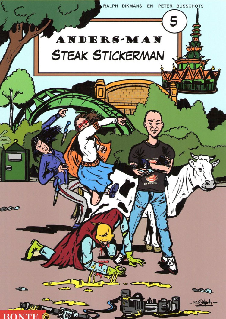 Even though the outset is extraordinary, Dikmans remains close to home for his inspiration. His hometown Boxtel is the setting of several stories, and many friends, relatives and colleagues have stood model for characters. His daughter appears as the anti-hero's daughter Anders-an, and his son appears as the villain Killer Cheese. The series' main nemesis is however the tattooed Bad Stickerman, who shares his looks with the Belgian comics collector Michel De Stickere.