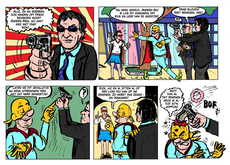The attention in the local press for his 'Anders-man' books earned Dikmans several assignments. Since 2017, he combines his work as a primary school teacher with commercial art jobs under the banner R@lph Dikmans Design. He has made illustrations for advertisements and folders, a comic strip for the rock band Hippe Gasten, and portraits for private individuals. Several people have commissioned Dikmans to draw a portrait of his idol Willy Vandersteen! In 2019, Dikmans won the StripBattle in comic magazine Stripglossy, which also earned him a spot in Leon Verhoeven's comics cookbook 'Strip Kookboek' (Personalia, 2019).