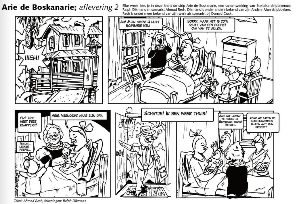 Dikmans has also expanded his comic activities to collaborations with others. Starting September 2020, he made 'Arie de Boskanarie', a weekly strip about animal cruelty. The feature is created and written by Ahmad Resh, and appears in the free local newspaper DeMooiBoxtelKrant. After publication of the first album by publisher Cliché in November 2021, it was announced that Arie de Boskanarie would become the official ambassador of the Zwarte Dennen forest around the town Staphorst. On the occasion of the annual Sinterklaas celebrations in the Netherlands, Dikmans and writer René Riva created the landscape-formatted text comic book 'De Betoverde Pepernoten' (Cliché, 2022). Dikmans has also worked as a scriptwriter for Stanley Heinze ('Dik Dieet', 'Monstober'). With writer René Riva, he has been working on the historical text comic series 'Verhalen van Vroeger' (2022-   ), which was first serialized on a weekly basis in the Mooi Boxtel Krant, and then in book format by Cliché. For his friend Ferry Segers, he has illustrated the covers for the 'Fred Dommelaar' comic books, published by Cliché.