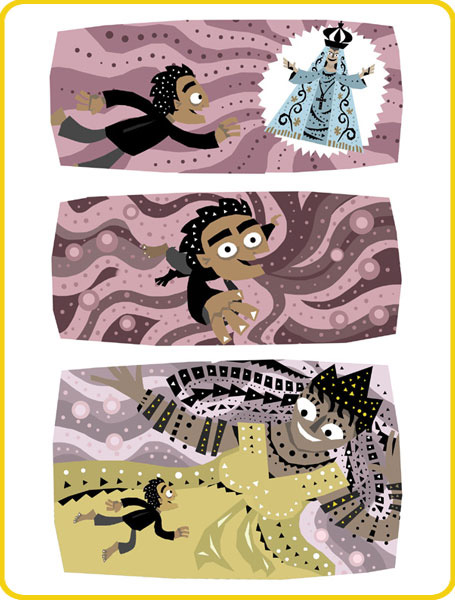 Other major works by André Diniz are 'O Quilombo Orum Aiê' (Galera Record, 2010) and 'O Negrinho do Pastoreio' (Ygarapé, 2012). Both were distributed to Brazilian public schools through a government program. The first book mixes history and fiction to tell the story of three slaves and a prisoner who, after escaping during a revolt in 1835, search for the legendary "quilombo" of Orum Aiê. This hinterland settlement was a place where they believed they could live free. The second book is a retelling of one of the most popular Brazilian legends, about a slave boy who is punished to death by a farmer who accused him of losing his horse. The next day, the farmer finds the boy alive and unharmed beside the Virgin Mary and the lost horse. After asking the boy's forgiveness, the boy says nothing and leaves galloping away with the horse.