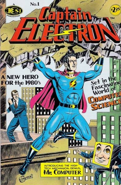 From the mid-1980s on, Jay Disbrow was public relations director for the Brick Computer Science Institute in his hometown of Brick, New Jersey. In 1986, he made a promotional comic book for this institute called 'Captain Electron', containing three stories in which characters like 'Mr. Computer' and 'Captain Electron' run through the history and current state of computer technology.