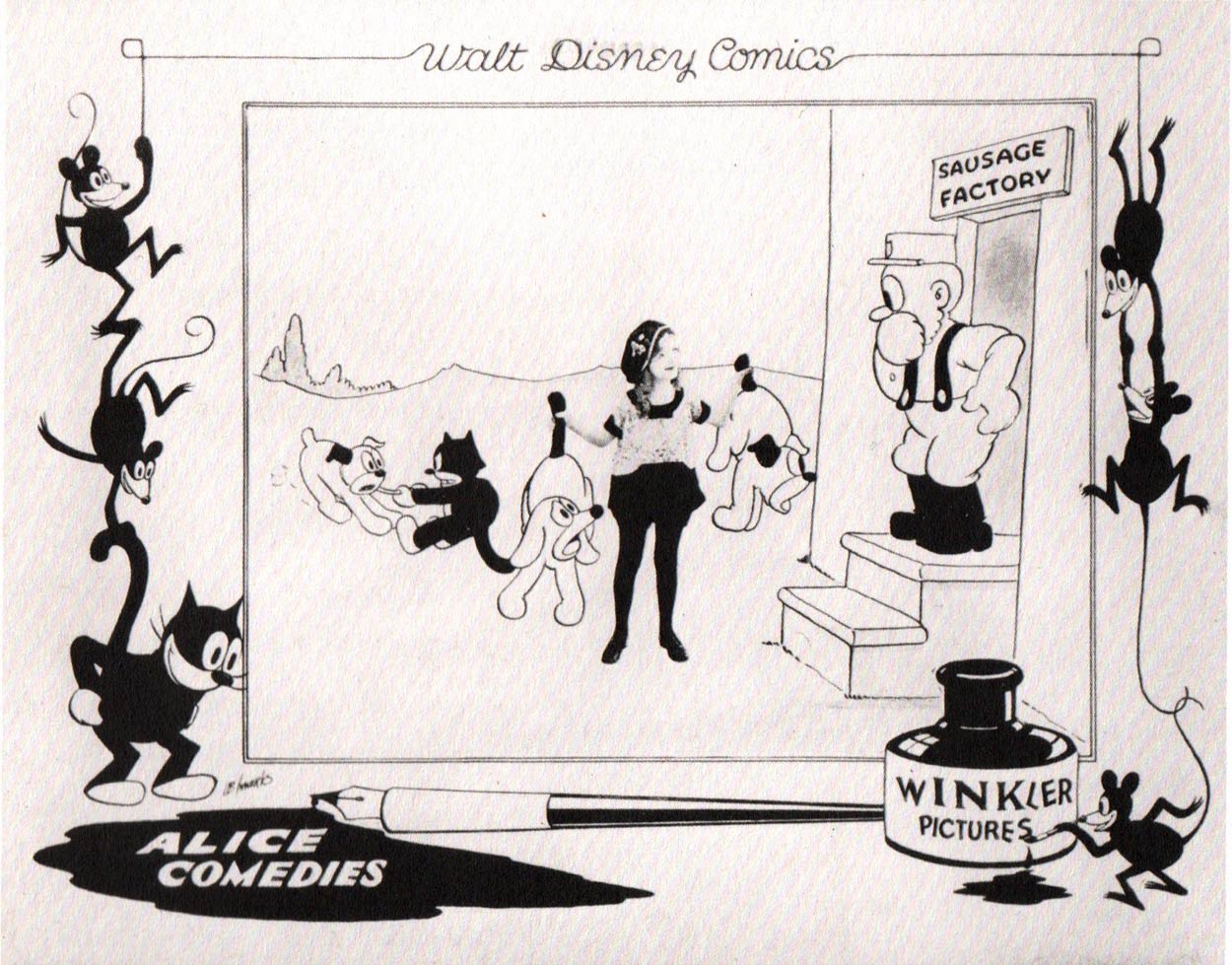 Walter Elias Disney was born in 1901 in Chicago as the son of a farmer. At age four, his family moved to Marceline, Missouri. The boy had fond memories of rural America, barnyard animals and the railway track next to his house, imagery he would evoke time and time again in his work. As a child, he absorbed many novels illustrated by artists like John Bauer, Wilhelm Busch, Gustave Doré, Edmund Dulac, J.J. Grandville, Theodor Kittelsen, Beatrix Potter, Arthur Rackham, Gustaf Tenggren and John Tenniel, to name a few. Later in his career Disney let his artists take inspiration from classic European painters, particularly the Romantic movement. In the field of comics, Disney admired Bud Fisher, George Herriman, Winsor McCay, George McManus, Clifton Meek, Carey Orr, Richard F. Outcault, Carl Emil Schultze, T.S. Sullivant and Ryan Walker. In 1942, he even let one of his artists, Floyd Gottfredson, create a special birthday drawing for publisher William Randolph Hearst, whose newspapers featured some of the finest comics of their day. In terms of cinema, Disney closely observed Charlie Chaplin, Buster Keaton, Harold Lloyd, Fritz Lang, Benjamin Christensen and F.W. Murnau, alongside animation pioneers like Winsor McCay, Max and Dave Fleischer's 'Koko the Clown' and Pat Sullivan and Otto Messmer's 'Felix the Cat'.
