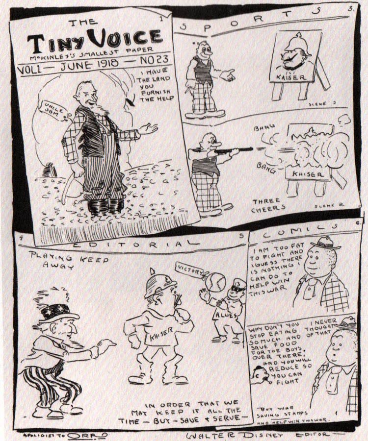 In 1917, the United States got involved with the First World War. Walt Disney was too young to be drafted, so he forged his birth certificate. He served in France as a Red Cross ambulance driver, but saw no military action. In his spare time, he drew cartoons for the army magazine Stars and Stripes. His first known published artwork appeared in a scrapbook handed out by the Chicago Public Library to families of First World War servicemen. The book, titled 'A Scrap Book Made For Our Soldiers and Sailors by Citizens of Chicago and The Chicago Public Library' (1918), not only included soldiers and the German Kaiser, but also the first two rodents in Disney's oeuvre. Back in his home country, Disney applied for a job as cartoonist at the magazines Life and Judge. He drew a try-out comic strip, 'Mr. George's Wife' (1920), but all his efforts got rejected, which made his interest shift to another medium: animation.