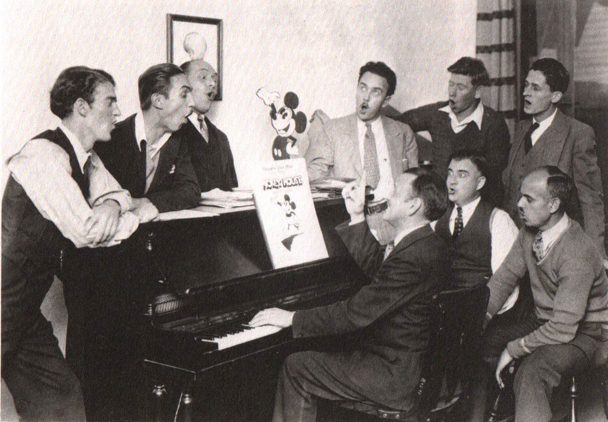 Carl Stalling in 1930 at the piano with standing around him Johnny Cannon, Walt Disney, Burt Gillett, Ub Iwerks, Wilfred Jackson and Les Clark. Seated are animators Jack King and Ben Sharpsteen.