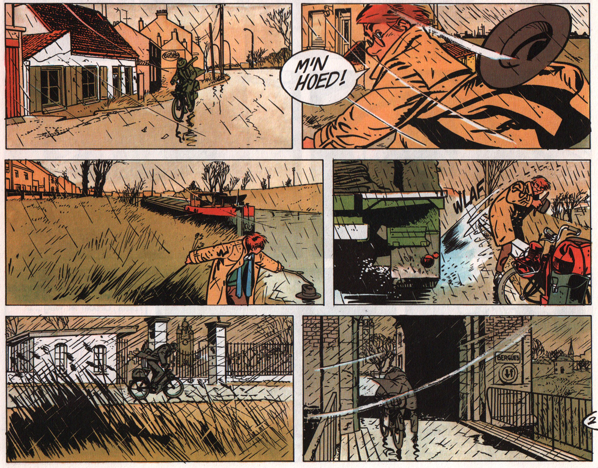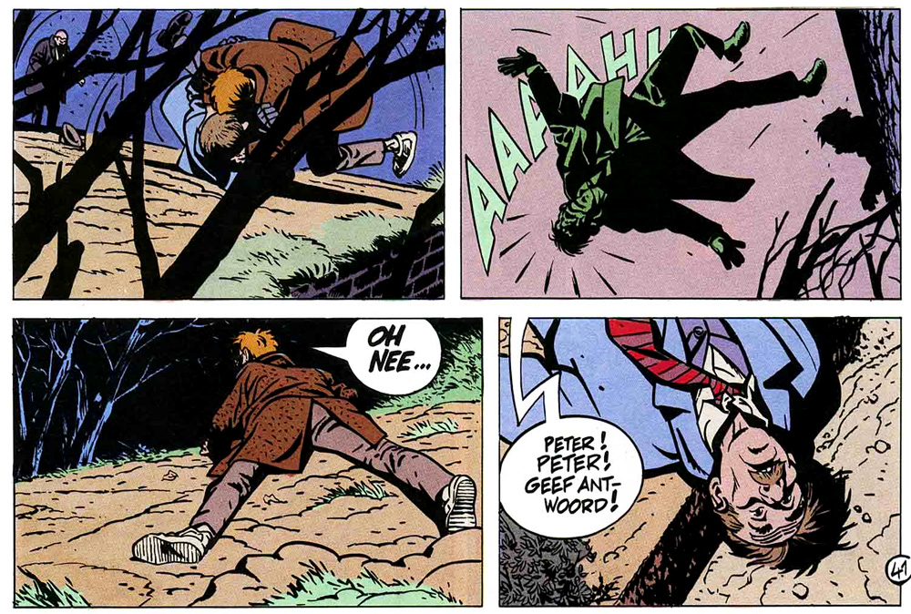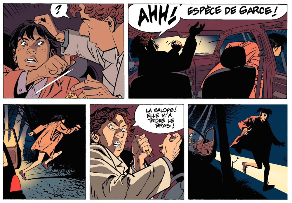 Dodier opted to stick with a limited cast of characters, and keep his hero's world small and recognizable. He deliberately never introduced a recurring nemesis. Jérôme's cases are all within the realm of plausibility, and do not involve grotesque villains, major criminal exploits or horrific abuse and violence. Events take place in the detective's own neighborhood, and most are low-key, unsensational criminal activities: blackmail schemes, hit-and-run accidents or mistaken identities, sometimes venturing into more serious family tragedies or crimes of passion. Only in rare occasions does Jérôme encounter professional killers, like in 'Le Cœur à Droite' (1996), when he helps a tramp who is chased by a hitman, or in 'Un Chien dans un Jeu de Quilles' (2006) when a misconnected phone call leads to serious trouble. Episodes in which Jérôme and Babette leave Paris are often situated in small communities -- breeding grounds for scandals and secrets. In his first solo story, 'Passé recomposé' (1986), Dodier sent his PI to the foggy Breton island Saint Mathieu, where the population is haunted by ghosts from the past, and in 'Le Gabion' (1997) he is involved a family tragedy near the Normandy coast. Several episodes take place in Bergues, a small community near Dunkirk where Jérôme grew up (not coincidentally, the region where Dodier lives and works). In 'Le Jeu de Trois' (1987) it is revealed that Jérôme's mother died when he was young and that his British father never showed any interest in his son. He was raised by his grandmother, his uncle Sébastien and his aunt Cécile. Jérôme's childhood also plays an important role in 'Le Couteau dans l'Arbre' (2017), and Babette's estranged father is introduced in 'Post Mortem' (2012). Despite these occasional revelations of the protagonists' past, most stories are plot-driven.