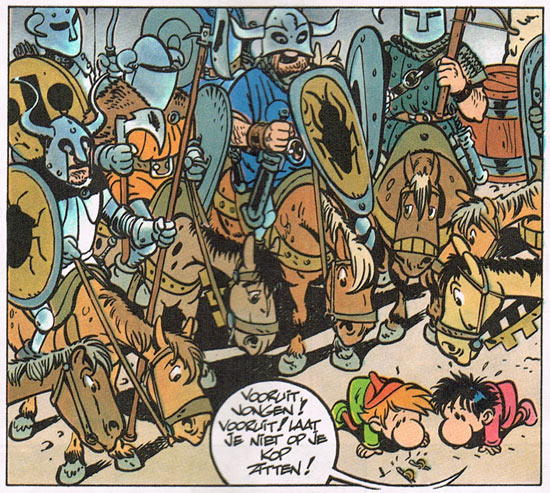 When Pistil folded, Dodier and Makyo transferred to Mercredi, a new weekly supplement to a couple of regional newspapers. However, since the magazine wasn't simultaneously launched with every paper, Dodier and Makyo's medieval humor comic 'Les Aventures de Gully' (1980-1990) debuted on different dates throughout December 1980. The very first print appearance happened in Mercredi-Dépêches on 3 December 1980. The fantasy world of Gully is set in the kingdoms Yridor and Onriflor. The two countries are at constant war with each other, but their inhabitants remain a jolly bunch. In battle they keep big smiles on their faces, and even during the cruellest torture they remain in good spirits. Laughter is the predominant religion of these kingdoms, but every hundred years, a baby is born with a highly contagious disease: melancholy! Anyone who comes close to an infected person is immediately doomed with instant depression. Yridor's Gully was born with the disorder, and lives with his granny Zita in the forest, far away from civilization. When he reaches the age of 10, however, he is sent to school, where he meets Mollo, a fellow-sufferer from Onriflor.