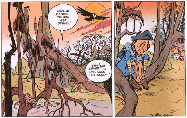 The Mercredi supplement was short-lived. From 1983 on, the two authors continued 'Gully' in the Belgian comics weekly Spirou, which also had begun running their the detective series 'Jérôme K. Jérome Bloche'. The magazine reprinted the original story, and published four more serials with the two outcasts Gully and Mollo the series stopped in January 1990. Besides being humorous, the adventures had a philosophical undertone. The swamps and woods surrounding the two kingdoms are inhabited by fantasy creatures. The odd green Blableur seems impervious to the boys' depressing nature, and becomes a companion during their adventures. The Blableur is however an extremely moody character. When he is happy, he brings good fortune. But when he is sad or angry, he causes utter boredom to the people around him. Éditions Dupuis collected the original series in five albums between 1985 and 1990. Dodier and Makyo attempted to relaunch 'Gully' in 2008 with a sixth episode, called 'Les Vengeurs d'Injures', but the revival turned out to be a one-off.
