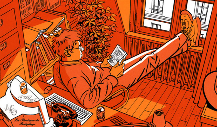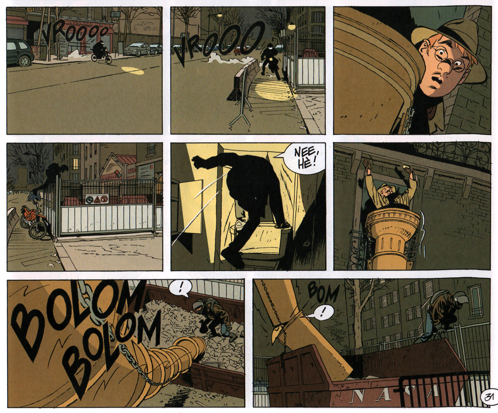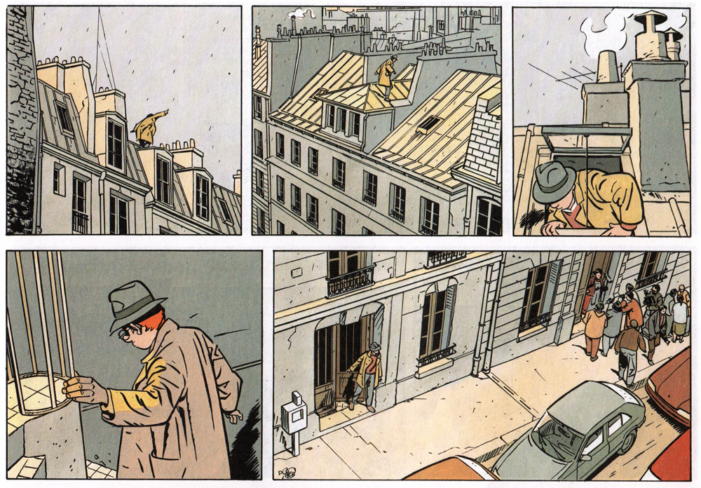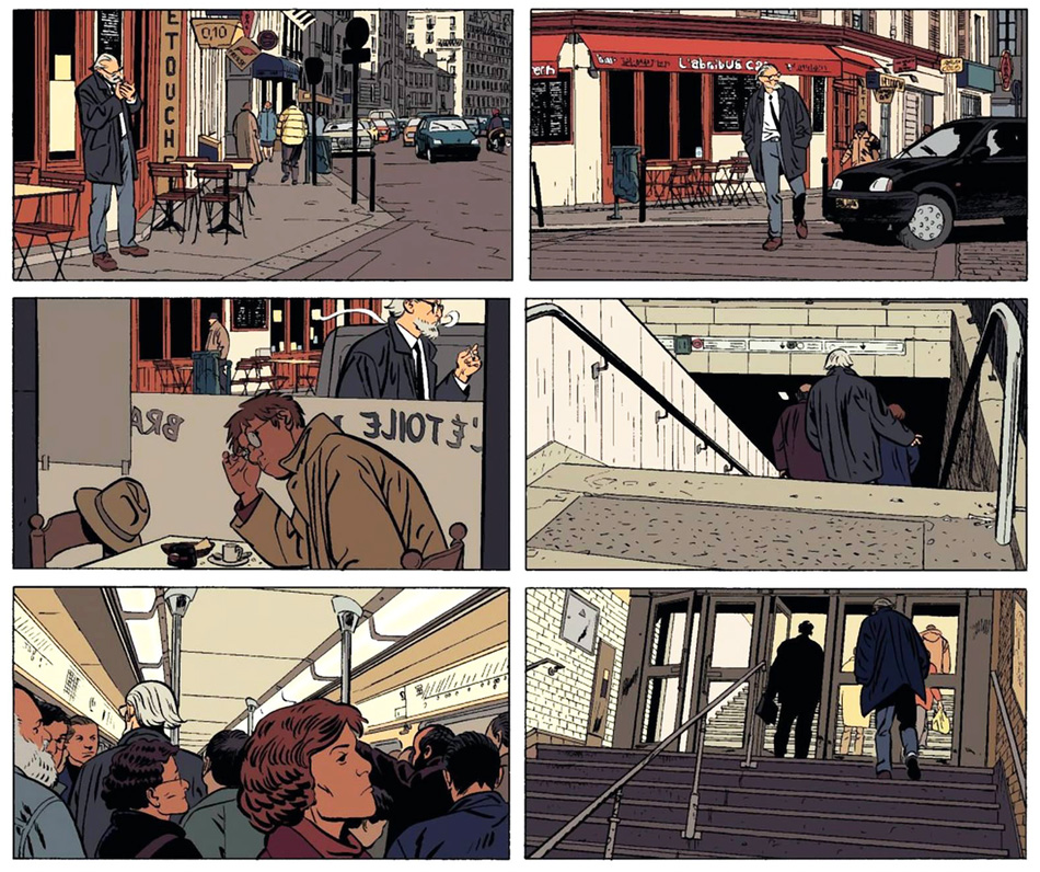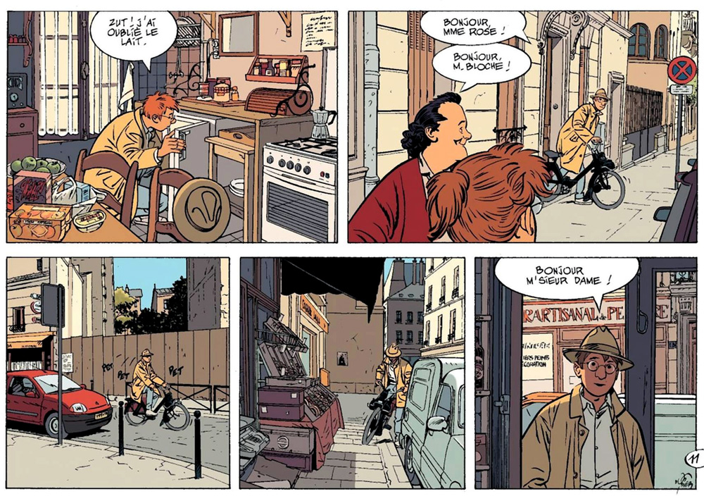 Adding to the series' authenticity is the author's graphic and storytelling technique, accompanied by the moody coloring of Studio Cerise. Gradually settling into a semi-realistic drawing style, Dodier became a master in depicting subtle nuances in his characters' expressions and movements. Sometimes the camera zooms out and dialogues are no longer needed; the artwork speaks for itself. Dodier's cinematographic direction forms an essential part of the series' overall tone. Instead of cutting between scenes, Jérôme's trip from location A to location B is part of the narrative. The author takes his time to show the detective getting his Solex from the inner court, exchanging civilities with his neighbors, and chuffing the Parisian streets. The camera angles are meticulously placed to achieve the desired flow or mood. Also, Dodier spends four months in crafting a watertight plot and writing the full script, leaving no ends untied when the actual drawing begins.