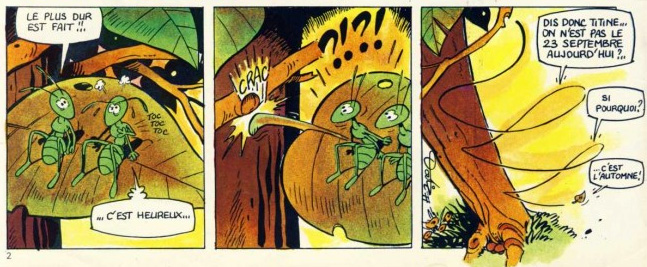 A fully self-taught artist, Dodier eventually teamed up with Pierre Makyo, who was practically his next door neighbor. The two men shared a studio, and worked well together; with Makyo providing scripts, and Dodier doing the artwork, the collaboration continued into the 1980s. When Dodier was fulfilling his military service in Germany, Makyo got them a job with the new ecological comics monthly Pistil, and they made their professional debut within its pages in 1977. They contributed two gag comics, the first starring the police man 'Janotus agent spécial', the other one about the wood ants 'Marty et Titine'. They also provided two short stories about 'Suzy La Petite Fourmi' (1980-1981) to Djin, and the six-page one-shot 'Léopold et Capucine' (1981) to Tintin, both also starring ants. Their comical detective 'Pijannot' (1980) was offered to Spirou, but although he was not selected by the magazine, this rejected detective served as a prototype for their later creation 'Jérôme K. Jérôme Bloche'. Created in a fully caricatural style, a revamped version of 'Pijannot à l'École' was eventually published as a mini-booklet in the center of Spirou #2579 in 1987.