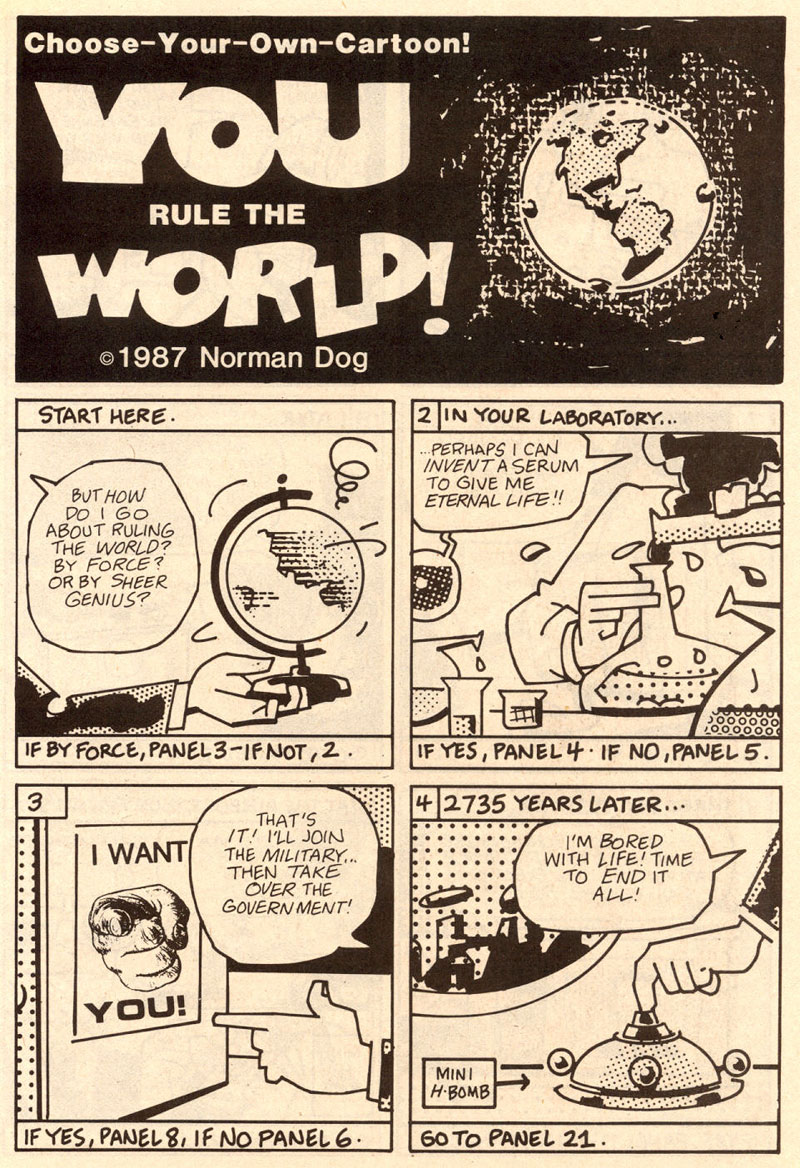 His comix and cartoons also appeared in The Utne Reader, Anarchy Comix, Robert Crumb's Weirdo, Raw, Spin Magazine, Anarchy Comics, The Chicago Reader, Suburban High Life and Funny Times, and in several handmade xeroxed mini-comix (including Dale Luciano's Dada Gumbo #5 in November 1984). Norman Dog's comic strips were generally made in an landscape format, and gave a witty, cynical, self-aware and at times absurd view on mankind, pop culture, bureaucracy, boredom, overreacting and general numbness. A 'Bad Habits' book collection was published in 1984. Norman Dog, ironically nicknaming himself "America's Most Beloved Cartoonist™", continued to contribute his comix and cartoons to the East Bay Express until 2007.