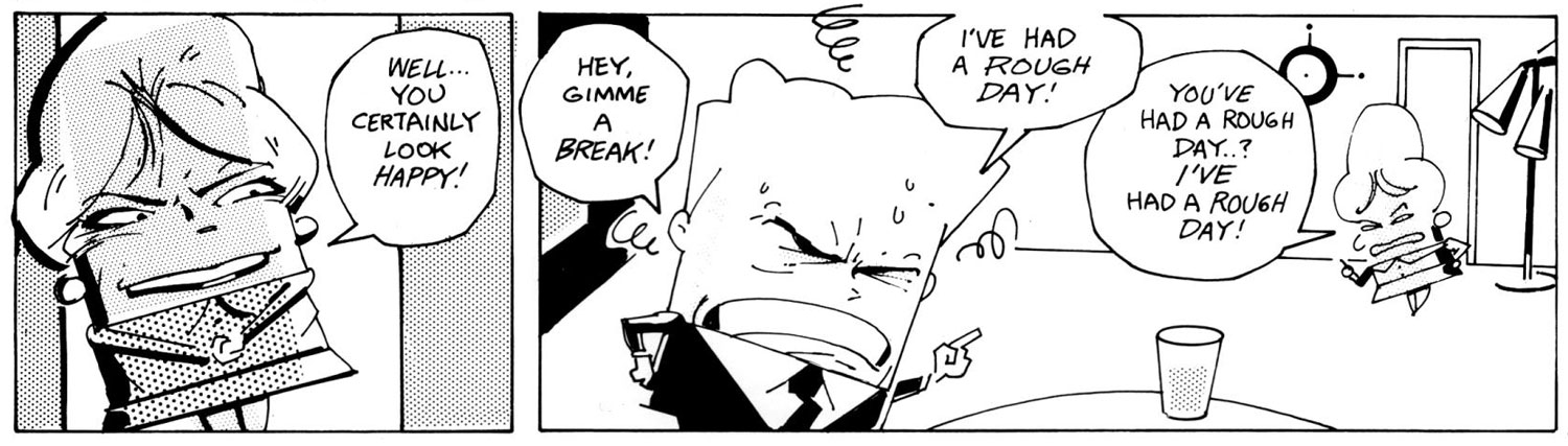 Norman Dog's name began to appear in alternative publications from the San Francisco Bay Area starting in 1979. He was best-known for his weekly feature 'Bad Habits' (1981-2007), which appeared in a select group of weekly papers, most notably the East Bay Express. Much of the humor in 'Bad Habits' stems from the disconnect between the words and images of the strip; the dialogue and captions were firmly rooted in post-modern existential angst, while the images always recalled reassuring and whimsical 1950s and 1960s comics and advertising logos. If it was in the pop culture of the 1950s or 1960s, it served as inspiration and subject matter for 'Bad Habits': television shows, Hollywood blockbusters and low budget genre films, advertising mascots, and educational science films all found their way into the strip. The black-and-white strip always featured Zip-A-Tone patterned and grey tone screens (comprised of tiny Ben-Day black dots) and often, large Ben-Day dots that recalled the Pop Art comic book panels created by artist Roy Lichtenstein. 'Bad Habits' mixed nostalgic and commercial imagery with self-aware, cynical and surreal viewpoints to create a distinctly anachronistic gag cartoon.