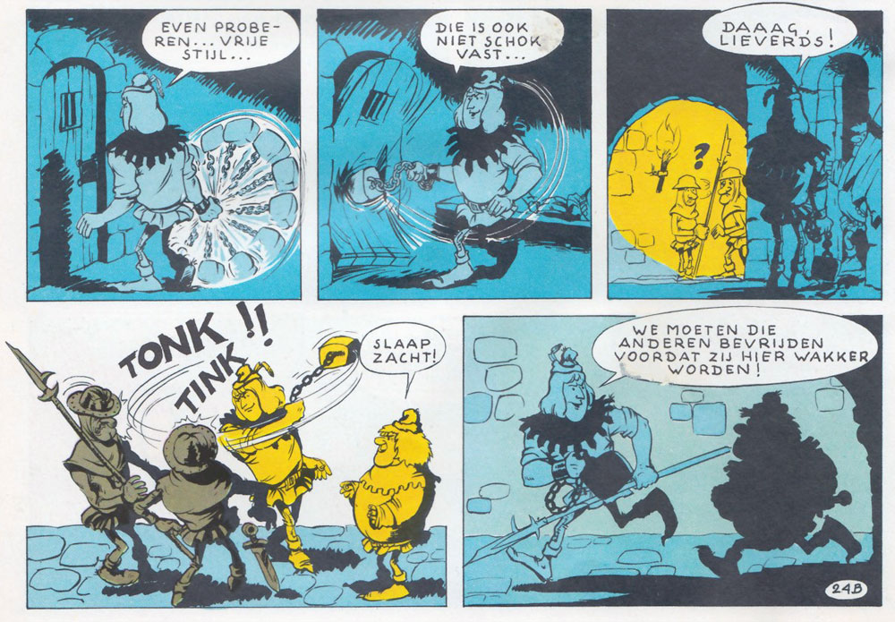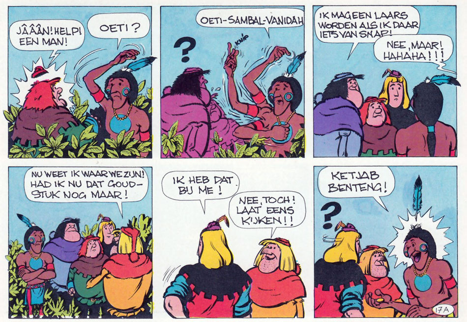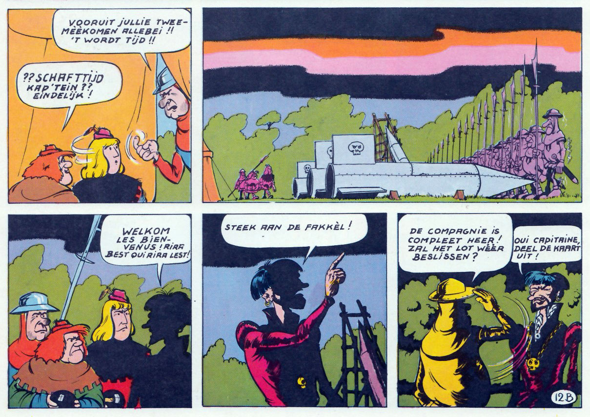 While Waterschoot and Roderyck made serious adaptations of the 'Jan Zonder Vrees' novels, the Dolphyn-Lagrillière version was more humorous and playful, presenting the main stars Jan Zonder Vrees and his good friend Dokus as a comical duo. The first two stories, 'De Gestolen Neus' (1970) and 'De Vliegende Brandstichters' (1971), were scripted by Ever Hulst (pen name of E. Verhulst). The third and final comic story, 'Gunnars Goudstuk' (1971), was written by Karel Verleyen - author of several original 'Jan Zonder Vrees' novels, but also a comic scriptwriter for Hurey, Jean-Pol, Rony Heirman and Jan Hoet. 'Gunnars Goudstuk' is by far the most outlandish story in the comic series, bringing the medieval Flemings all the way to pre-Columbian America, where they meet Native Americans.