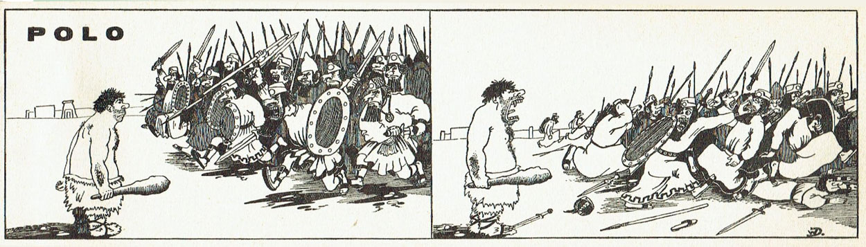 Besides painting and illustration, Dolphyn also ventured into cartooning. From 1958 on, he made the pantomime comic strip 'Polo' for Clio, a magazine about history education. Starting in the first issue, each episode showed the main character in a different historical era. Dolphyn continued to make educational and humorous drawings for Clio until 1977.