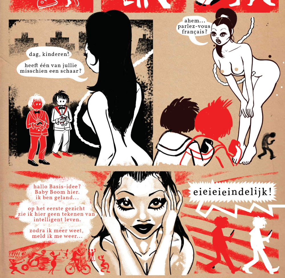 In the past, Draax has created an occasional comic page for a magazine assignment. In 2020, he began working on his first graphic novel 'Baby Boom', about a female alien who is sent to earth to warn the people of a catastrophe. In a dystopian future, she lands naked in the city of Amsterdam, as a record cover with a naked couple led her species to believe that earth people wear no clothes. While Baby Boom befriends a young Moroccan woman who works in a garment workshop - she dresses her in a Comic Sexy dress - she tries in vain to get her message across. As in real-life, everyone uses her appearance for their own agenda. Feminists follow her example and bare their breasts, men want to abuse her and trendsetters want to use the alien woman to sell their products.