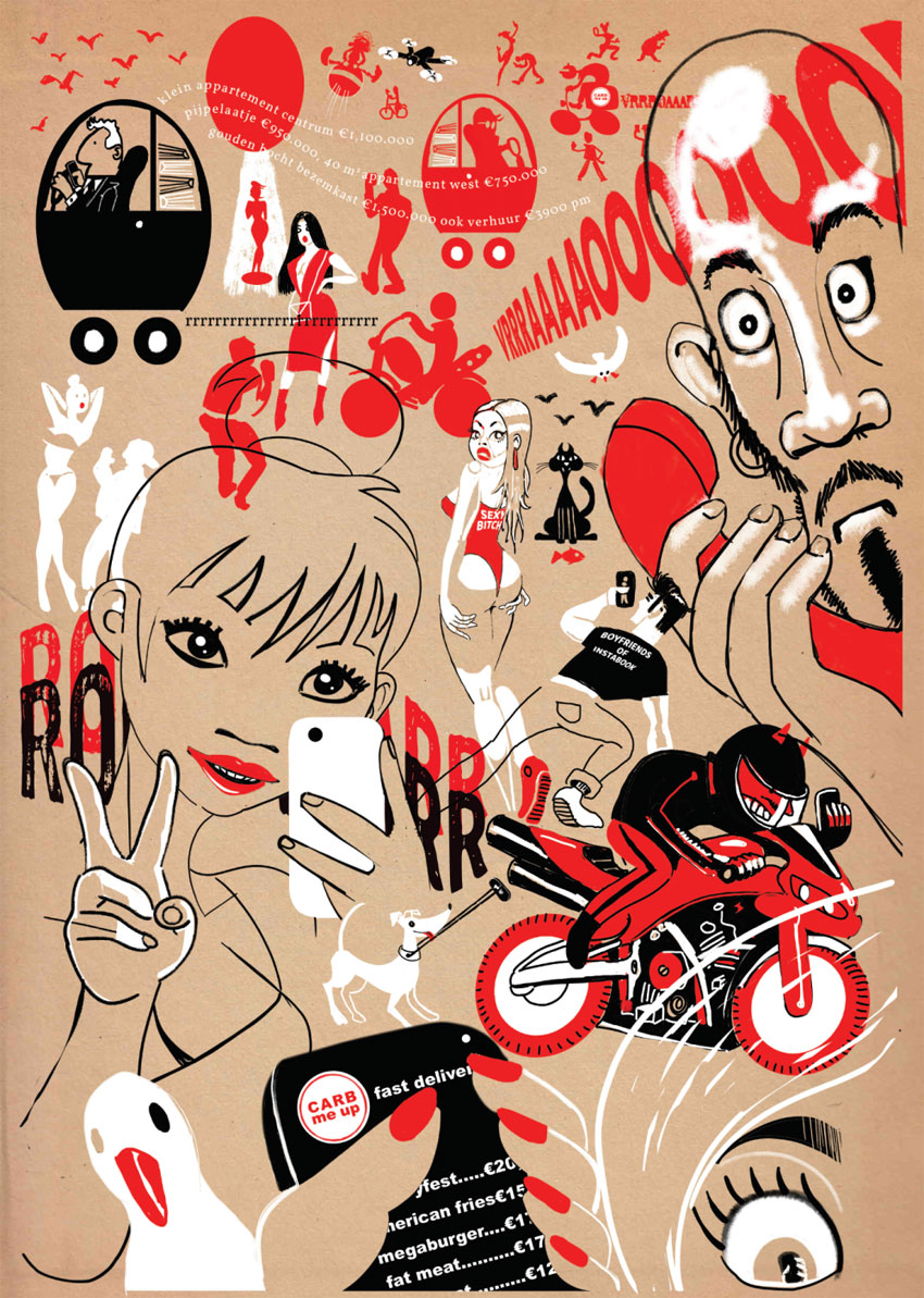 With this dystopian allegory, Draax painted a picture of our modern society, where no-one listens to each other anymore and opposites drift further apart by the day. His prediction of the future is a grim one, where mankind shall succumb to an overkill of information, continue to hop from one trend to another and go under on its path of nationalism and navel-gazing. A critical and satirical view of our modern society, Draax's graphic novel 'Baby Boom' (Hum!, 2023) is in many ways comparable to the 1968 pop art comic 'Iris' by Lo Hartog van Banda and Thé Tjong-Khing, which commented on the role of pop culture and consumerism in the 1960s society through a futuristic depiction of Amsterdam.