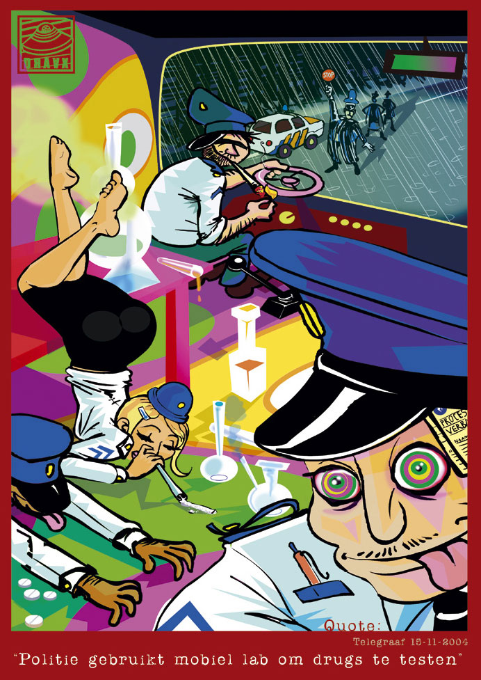 Magazine comic strip about police officers using mobile labs to test drugs.
