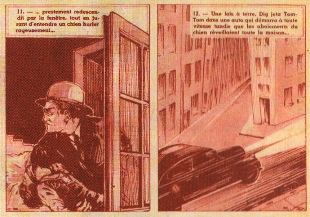 Besides illustrating text stories, Constant Dratz is also identified as the original artist of the adventure comic feature 'L'Étrange Aventure de Tom-Tom aux Amériques' ("The Curious Adventure of Tom-Tom in the Americas"). Written by Raymond Duquenne, the feature was serialized from December 1940 until the first semester of 1941. In a dream, a young man called Tom-Tom is forced to serve as a guinea pig for an elixir of old age, developed by an old scientist in a castle in Arizona. However, with a different dosage, it can become an elixir of youth. With the help of his dog Ric-Rac, who mixes the elixirs, Tom-Tom manages to escape. He goes home to his parents and, when he wakes up, tells his adventure to his dog. Dratz drew only the first six episodes of the story. He was succeeded by L. Neyaert for installments 8 through 11.