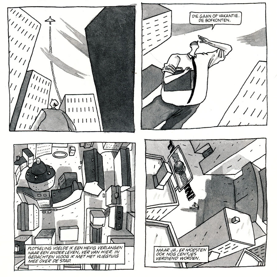 Guido van Driel's experiences as a painter also drifted him back to comics, and he began working on a sequential story in colored ink drawings. The self-taught artist found inspiration in the coloring and graphic styles of Jacques de Loustal and Lorenzo Mattotti. But Art Spiegelman, Daniel Clowes and Chris Ware have served as influences too. Closer to home, he has expressed his admiration for Fiep Westendorp and Jaap Vegter. A visit to the Amsterdam comic book store Lambiek called in the third stage of Guido van Driel's career. Owner Kees Kousemaker advised him to present his story to publisher friend Hansje Joustra, owner of the Oog & Blik imprint. Joustra was impressed, but didn't dare a full-color book release by an unknown artist. Therefore Guido van Driel's first graphic novels were published in grey tones.
