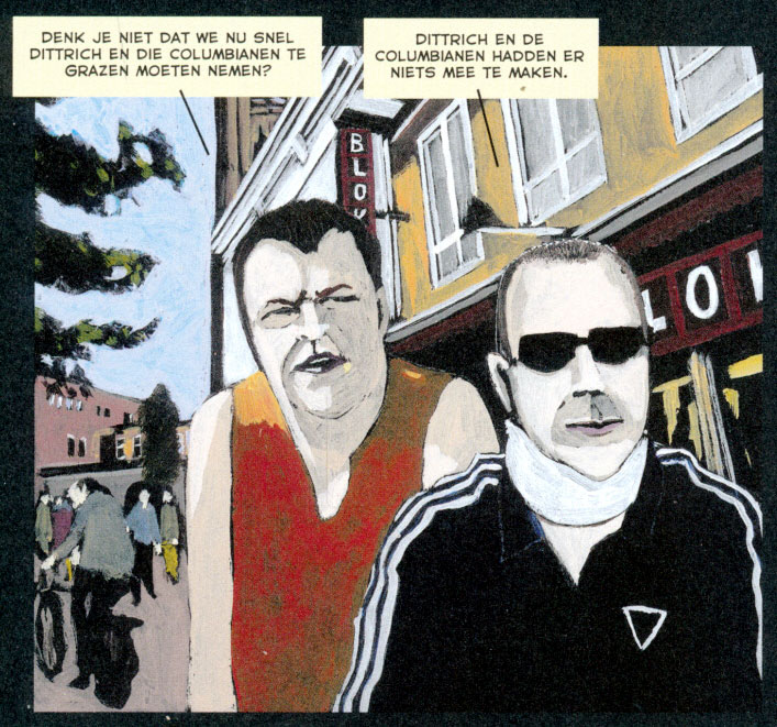 In the meantime, Van Driel continued to paint and make illustrations, as well as an occasional comic. In the mid-1990s, he made a comic strip called 'Kiddo' for a magazine of the funeral organization AVVL. In 1997, he adapted the short story 'De Bovenman' by Cherry Duyns into the comics format for the 250th issue of the literary magazine Bzzlletin. Amsterdam's Red Light District was the setting for Van Driel's next book, 'De Fijnproever' ("The Gourmet", 2000). Main character Nico Bodewes is a saxophone repairman who regularly visits prostitutes, and based on an actual friend of the author. Van Driel was inspired by his friend's philosophies about prostitution, and turned them into a documentary in text comic/diary format. It honorably covers Nico's friendly relationship with two of the prostitutes, whom he treats on a three course dinner. It was Van Driel's first full-color graphic novel, painted with acrylic on black paper. This technique would become his trademark.