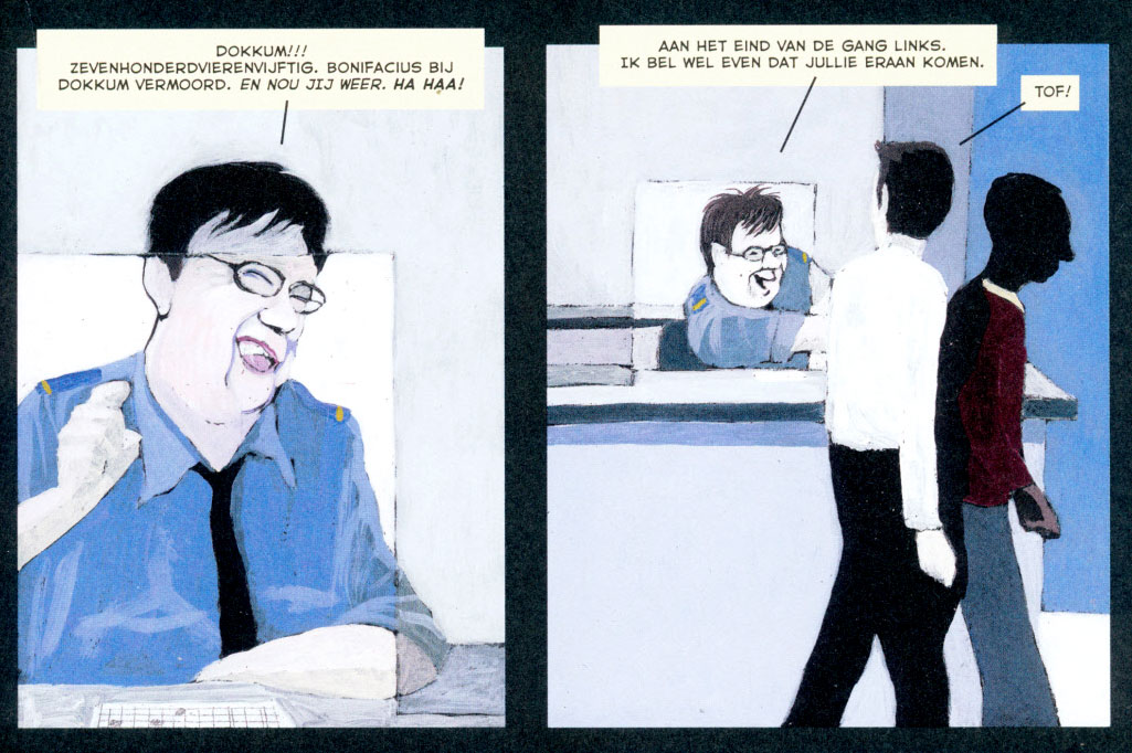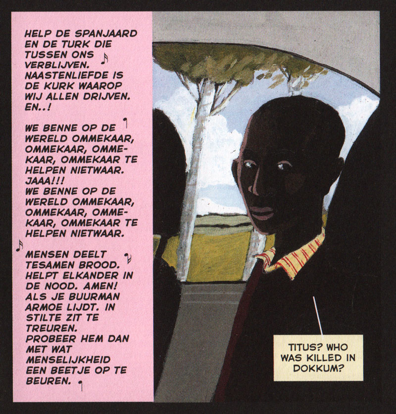 While 'Toen We Van De Duitsers Verloren' took four years to make, Guido van Driel had only one year to complete his next graphic novel. For the inauguration of the new town hall of Dongeradeel (nowadays part of Noardeast-Fryslân), Van Driel was commissioned to make a graphic novel about the "identity" of the Dongeradeel region. It was intended by the city council as a promotional gift. Dongeradeel was a municipality consisting of the historical city of Dokkum and 28 surrounding villages. Dokkum is best-known as the location where, in the year 754, Saint Boniface was murdered by the Frisians for taking down their holy tree. Van Driel took this event as a leitmotif, but otherwise turned the story into one of his most socially committed works yet. The book's two seemingly unrelated storylines follow a traumatized Angolese refugee seeker who is about to be deported on the one hand, and on the other hand two criminals searching for the culprit of a failed assassination attempt. Added to the mix are a local waiter with a sick cat and a couple sharing a great grief. All their roads lead to the city of Dokkum, where they coincidentally help each other out. The book title 'Om Mekaar in Dokkum' ("For Each Other in Dokkum") refers to the slang lyrics of a song by Annie M.G. Schmidt from the TV show 't Schaep met de 5 Pooten': "We benne op de wereld om mekaar, om mekaar, om mekaar, om mekaar te hellepe, nietwaar" ("We are on the world to help one another, one another, one another, one another, aren't we?").