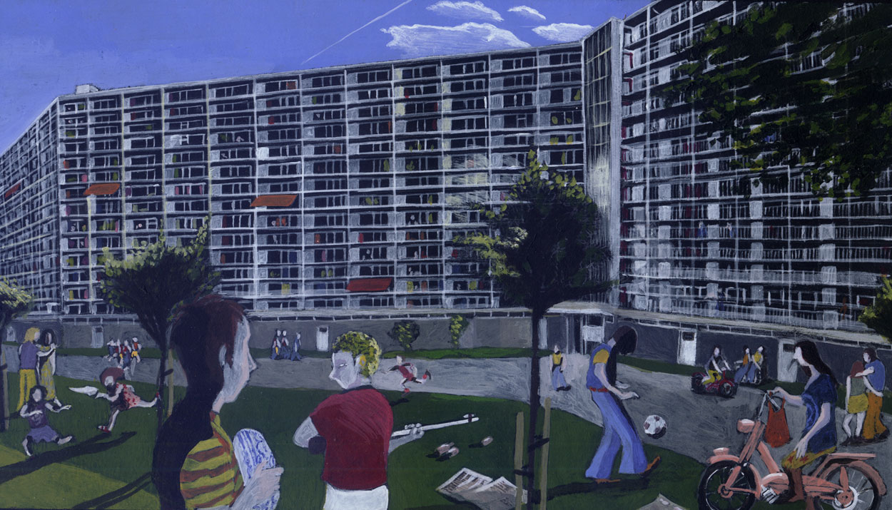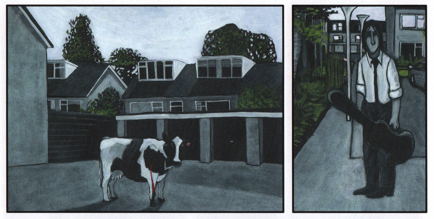 Because of other projects, it took seven years before the release of Guido van Driel's next graphic novel. 'IHS - In Hollandia Suburbia' (2019) turned out as one of the most alienating entries in the author's body of work. Against the backdrop of yet another Dutch suburban residential area, a Beatlesque band is confronted with strange events. One band member is found dead in the bushes, another one loses his arm after being hit by a piece of metal falling from the sky. The utterly dreary setting is in sharp contrast with the colorful characters and the strange appearances of UFO's and the Virgin Mary, who silently witnesses all the mayhem. Feeling that "people should dare to believe in miracles", the author leaves much of the explanations for the events to the imagination of the readers. The first volume of 'In Hollandia Suburbia' was released in 2019 by Concerto Books, a new imprint managed by former Oog & Blik publisher Hansje Joustra. On 1 November 2019, the book was presented in comics shop Lambiek, where several of Van Driel's original paintings for the book were on exhibit. In 2021, Van Driel released the second volume of 'IHS- In Hollandia Suburbia'.