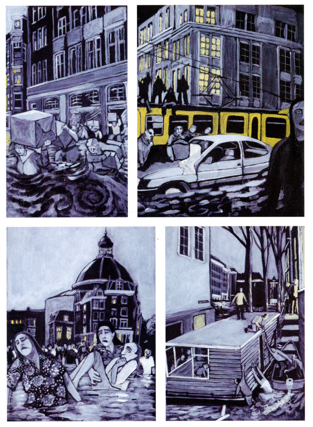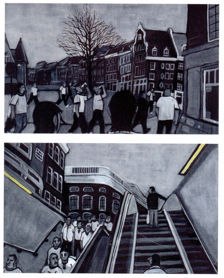 After these excursions, the author chose his hometown Amsterdam as the location for his next two graphic novels. 'De Ondergang van Amsterdam' (2007) was also originally a commission. The opinion magazine Vrij Nederland asked Van Driel to make a comic about Rembrandt on the occasion of the classic painter's 400th birth year. It was serialized in two parts in the issues of 1 and 8 July 2006, and then published in book format by Oog & Blik. In the Rijksmuseum, the house painter Titus is captivated by Rembrandt's painting of the prophet Jeremiah mourning the destruction of Jerusalem. It is the instigator for a story about climate change and the moral and ecological decline of the Dutch capital, fuelled by the prediction of Titus' colleague "Robuuste Robbie" that Amsterdam will be flooded within twenty years. 'Gasten' ("Blokes Abroad", 2012) portrays the city through the eyes of two British tourists. Starting off as a typical spree filled with booze, vulgarity and magic mushrooms, the story eventually shifts towards the tragic reason for the trip. In both books, the author brings his observations of Amsterdam's population and character through hallucinogenic and spiritual journeys. 'Gasten' appeared in French as 'Les Visiteurs' (L'Agrume, 2014).