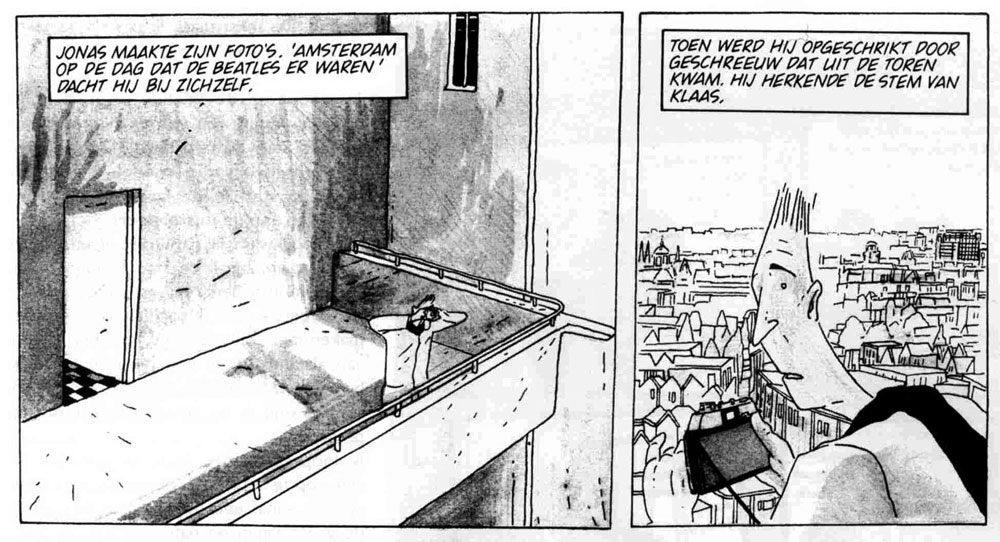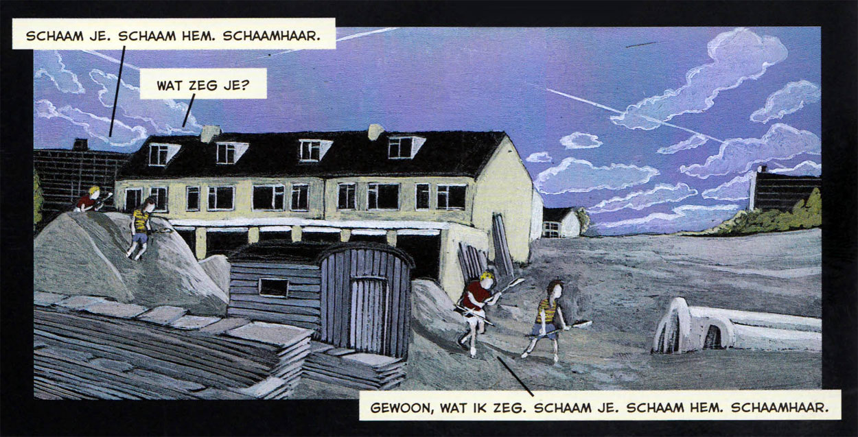 With a grant from the Fund for Visual Arts, Design and Architecture (Fonds BKVB), Van Driel created his next graphic novel, 'Toen We Van De Duitsers verloren' ("When We Lost To The Germans", 2002). A moral drama about the disappearance of a little girl, the story takes place shortly after one of the biggest traumas in Dutch soccer history: the defeat by the Germans during the 1974 World Cup. The story focuses on two teenage boys who spend the day making mischief. Set in the then-new Zaandam neighborhood Hoornseveld - where the author grew up - the book offers its fair share of 1970s nostalgia. The furniture, playing in the sand of the upcoming new housing estate, blowing berries through PVC pipes, living in large, impersonal flats, all interlaced with true to life dialogues and subtle character traits. The book was a joint production of the publishers Oog & Blik and De Harmonie, and was festively presented in Gallery Lambiek on 7 November 2002. In 2016, a German translation appeared at Avant-Verlag under the title 'Als wir gegen die Deutschen verloren haben'. In 2023, coinciding with Van Driel's movie adaptation of the story, the book was re-released by Concerto Books with corrections in drawings and text, and an accompanying dossier.