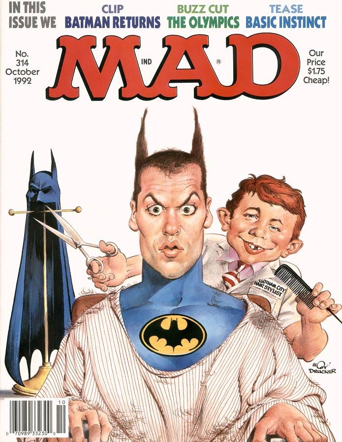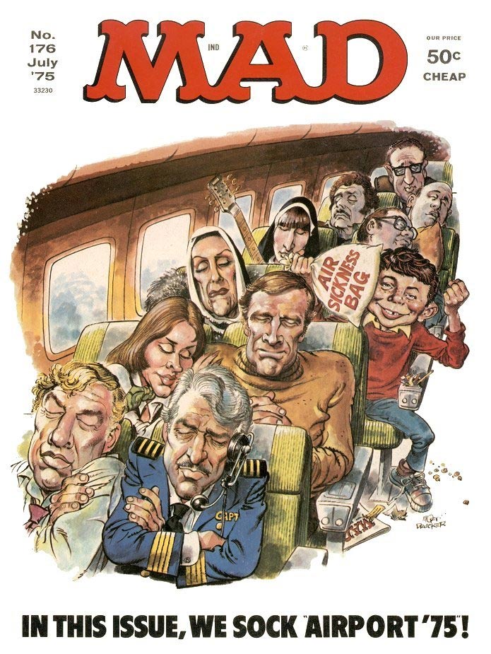 Cover illustration for Mad issue #176 (July 1975), parodying the disaster movie 'Airport', and for Mad issue #314 (October 1992), spoofing 'Batman' actor Michael Keaton.