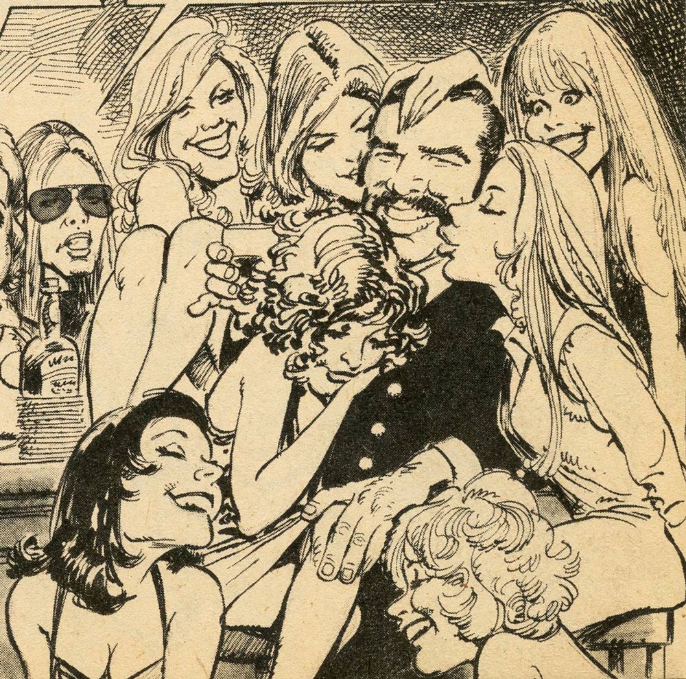 Showcase of Mort Drucker's ability to draw beautiful women, featuring actor Burt Reynolds (from Mad's parody of 'My Fair Lady', retitled 'My Fair Laddie', in which feminists try to turn a male chauvinist into somebody who respects women, issue #167, June 1974). The bespectacled woman on the left, looking on in disgust, is famous feminist Gloria Steinem.