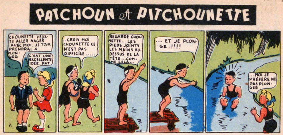 'Patchon et Pitchounette' (Nine #27, 18 July 1944). Patchon shows Pitchounette how to dive. After falling into a river that isn't deep enough, she comments: "I prefer not to dive."