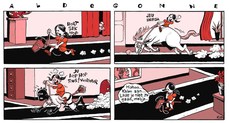 Duchateau's oldest and longest-running comic character is 'Aldegonne', a black-haired girl in pigtails, always dressed in a red dress and skirt. She has no mother, only a strict, mustached father. The pitiful child finds herself in absurd and disturbing situations beyond her comprehension or appreciation. The gag comic debuted in the late 1990s, and has appeared in magazines like Incognito, Zone 5300, Stripgids, Beeldstorm, Knack and the Zipp supplement of De Standaard. Other early recurring characters in Kim's work were 'Geoffrey het Lijk' ("Geoffrey the Corpse"), 'Samuvar de Domme Cycloon' ("Samuvar the Stupid Cyclone") and 'Gérard le Mouton-Double' ("Gerald the Double-Sheep").