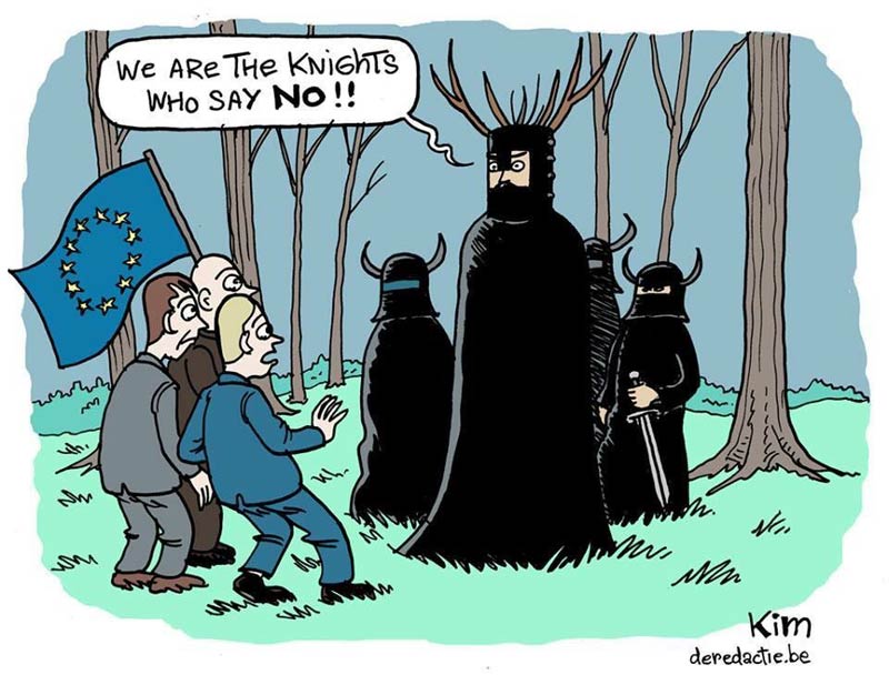 2016 cartoon about the Brexit, featuring the Knights Who Say "Ni" from 'Monty Python and the Holy Grail', which amused John Cleese.