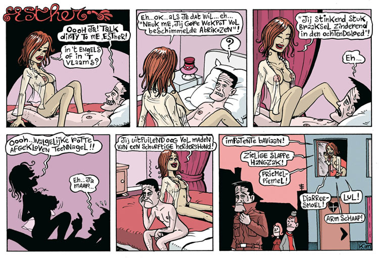 Oogachtend has released several collections with Kim's work, starting with 'Unne en andere vingerkrampen' in 1999. This was followed by several other books, including 'Uitzonderlijk Zwaar Vervoer' (2001, which had a foreword by Herr Seele), 'De Vlucht van de Kloothommel' (2003), 'Herman, de Lichtrode Ridder' (2003, a gay parody of Willy Vandersteen's 'De Rode Ridder', drawn by Tom Bouden), and the 'Esther Verkest' series. In 2009, Oogachtend released Kim's first full-length comic book, the pantomime and black-and-white 'Antisol', a tragicomical story about the sun turing into the Antichrist. Under its Matsuoka imprint, Ballon Comics released Kim's 'Tinderstruck!' (2017), an absurd social satire/surrealist self-help book on love and sex in the days of online dating.