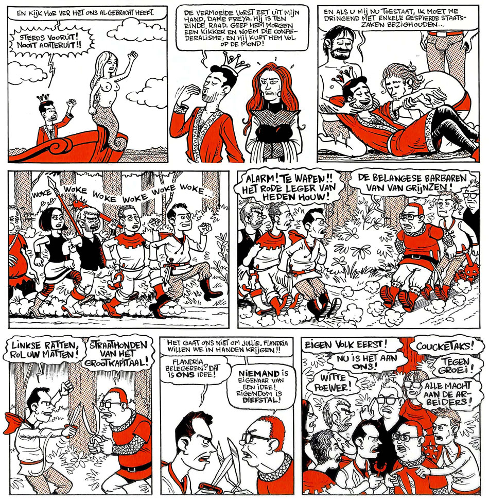 Otherwise, Slangen and Duchateau made their comic more their own thing. The titular "exhausted king" is Flemish-nationalist party leader Bart De Wever (of the party N-VA), who is portrayed as a sour, embittered man, trying to form a coalition with socialist party leader Conner Rousseau (of the party Vooruit). The latter is such a narcissistic dandy that he doesn't realize the importance of his governmental duties. Outside the castle, barbarian hordes threaten the kingdom, one representing the far-right party Vlaams Belang, the other the communist party PvdA. Various politicians are cast as medieval stock characters, while the story also features cameos of Flemish TV hosts, journalists, novelists, musicians, sports figures and other celebrities, including cartoonists Jeroom and Herr Seele.