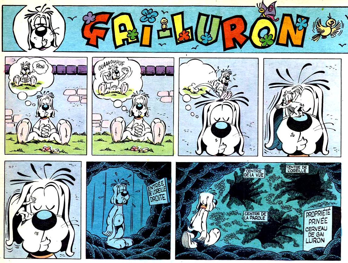 In 1967, Dufranne became a regular artist for Le Journal de Pif (later Pif Gadget) of Éditions Vaillant. He started out making game pages with 'Gai-Luron', the melancholic dog created by master humorist Marcel Gotlib. He continued to assist Gotlib on the inking of this comic in the following years. Beteen 1967 and 1976, he was also responsible for most of the artwork in the 37 issues of Vaillant's pocket publication Gai Luron Poche. In 1969, Gotlib passed the pencil for 'Gai-Luron' to Dufranne, who also became responsible for the scripts a year later. Gai-Luron's gags continued until 1976, when Dufranne had a conflict with the editors of Pif Gadget and left the magazine. Older episodes would be reprinted for years to come.