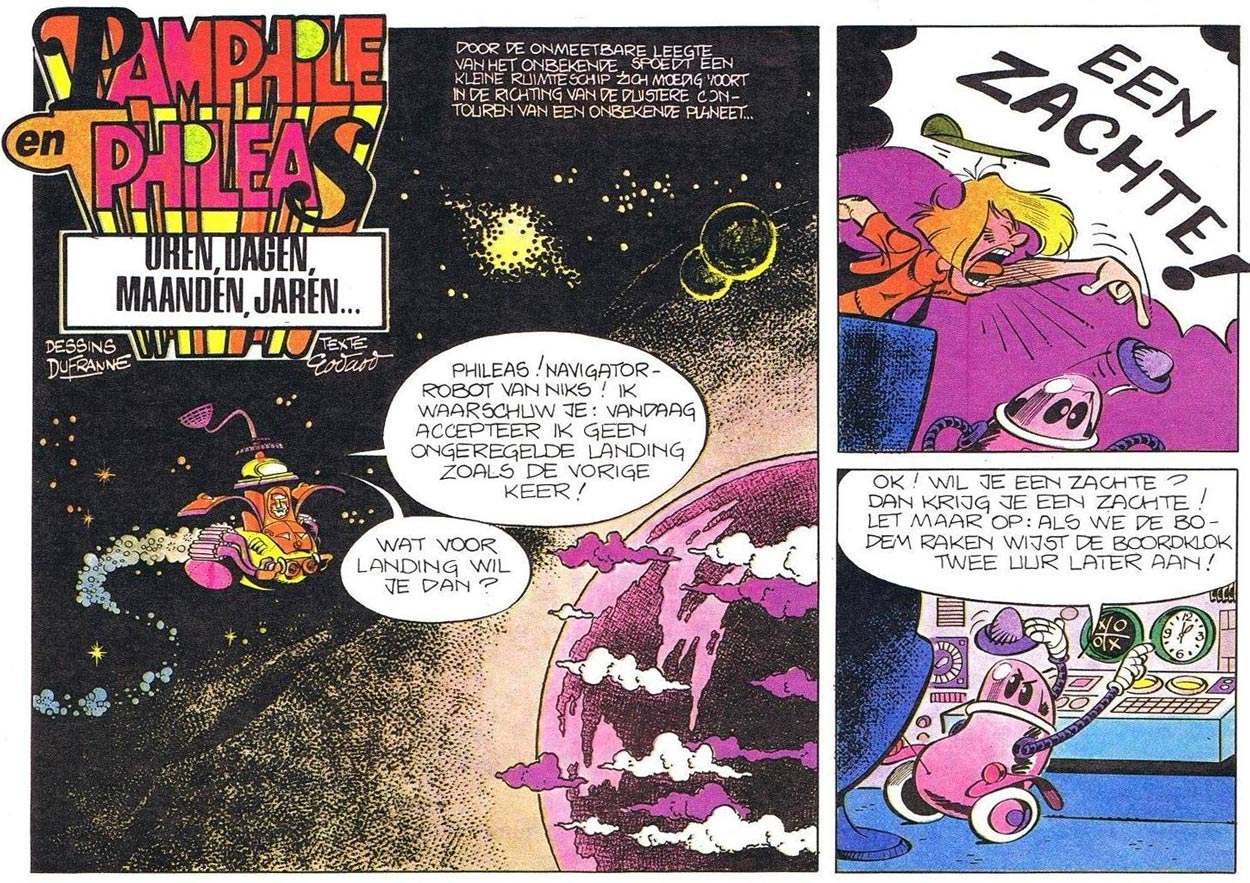 In 1975, Dufranne had additionally created the caveman comic 'Réhak l'Idiot des Cavernes' with Michel Motti as a back-up feature in the SEPP comic books Agent Spécial and Fantastik. He started working for Tintin magazine after his tenure with Pif Gadget ended, drawing the series 'Pamphile et Philéas' (1978-1986) from scripts by Christian Godard. In 1977 and 1978 he also created the frog 'Plop' with scriptwriter Serge le Tendre, for a magazine of the same name financed by the oil company Antar. The magazine lasted only six issues, and also featured 'Norbert le Lézard' by Régis Loisel and Patrick Cothias. Another creation was 'Les Aventures de Bédé' with Dominique Rocher in Télé Junior in the early 1980s. These stories were subsequently collected in albums by Glénat, which remained Dufranne's only book publications for over twenty years. Dufranne drew many one-page gags and game/riddle pages with 'Mickey Mouse' and other Disney characters for Le Journal de Mickey from 1978 until 1994, the year of his retirement.