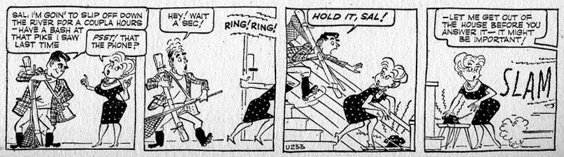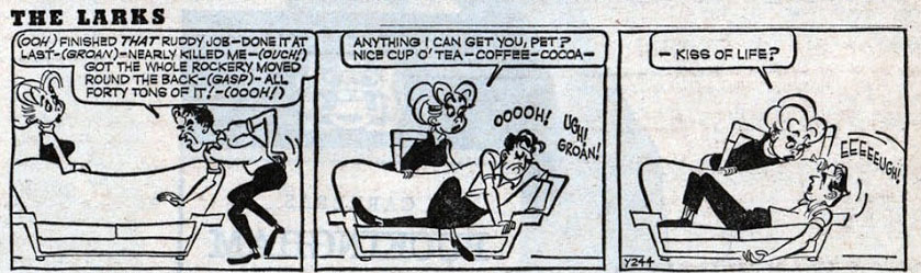 Based on a radio comedy of the same name, the comic's initial episodes were written by radio scriptwriters Bill Kelly and Arthur Lay, followed by Robert St. John-Cooper (who was once a cartoonist himself and wrote stories for TV series). From 1962 on, Brian Cooke took over and changed the working class family into a middle class one. In the late 1970s, Ian Gammidge became the final scriptwriter. When newspaper tycoon Robert Maxwell bought the paper in July 1984, the new management wanted innovation. So 'The Larks' and Bill Tidy's equally long-running comic 'The Fosdyke Saga', were both terminated on 28 February 1985.