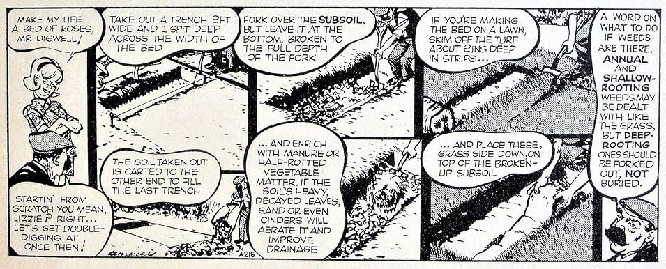In the same fashion, Dunkley also drew a longtime comic strip about gardening for the Daily Mirror, called 'Mr. Digwell'. Initially created in 1946 by writer Ambrose Heath and the cartoonist Bernard Venables, Dunkley took over during the 1950s, working mostly with scriptwriter Ian Gammidge. Until the early 1990s, the feature provided gardening tips in comic format given by Mr. Digwell, a gardener with a large mustache. He often works together with his friends Jack, Lizzie, Mr. Newcome, Mr. Busyman and the newlyweds Jack and Pru. In 1977, a book compilation was published: 'Mr. Digwell's Everyday Gardening Book' (1977), which was re-edited into the magazine special 'Gardener's Mirror', issued by the paper in 1981.