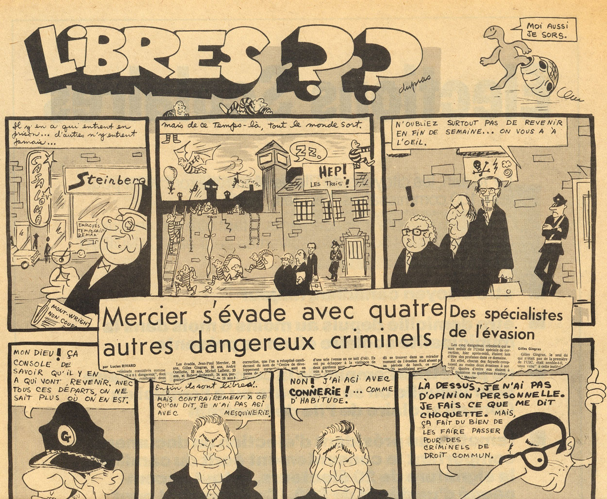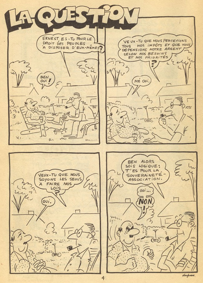 Between November 1967 and June 1968, Dupras became even more politically outspoken when he joined L'Indépendance, the official magazine of the Rassemblement Pour L'Indépendance Nationale, who favored Québec's independence. For this magazine, he created his first comic strips, which already dealt with the politics of the day. Journalist Jacques Elliot recognized his talent and invited him to participate with the left-wing Sunday magazine Québec-Presse. Dupras always felt that comics are far more interesting than just a caricature in a one-panel cartoon. To him, the genre catches the readers' attention and has the advantage of being able to tell a story. They also allow more opportunity to let different characters discuss different ideas.