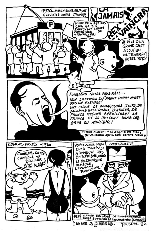 Comic strip for '150 B', about the 150th anniversary of Belgium in 1980. It criticizes the rise of Belgian Fascist leader Léon Degrelle, while using Tintin as a protagonist. This references the fact that 'Tintin' creator Hergé and Degrelle once worked for the same newspaper, Le Vingtième Siècle.