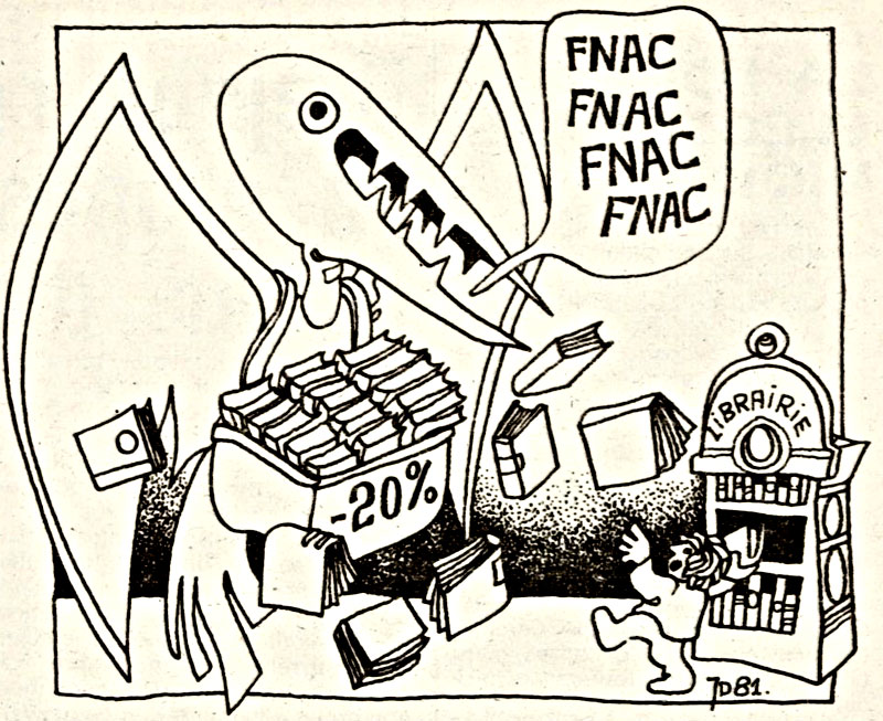 Cartoon for Le Drapeau Rouge of 2 November 1981, about the FNAC chain devouring the smaller, independent booksellers.