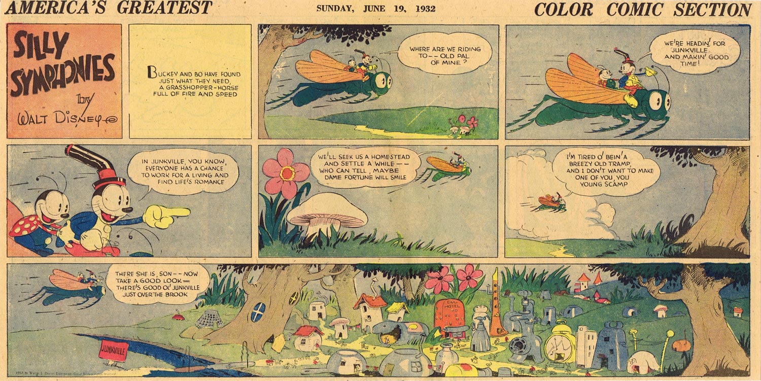 Oddly enough, the first 'Silly Symphony' comic to debut on 10 January 1932 wasn't an adaptation of a pre-existing animated short. 'Bucky Bug' was a completely original creation by Duvall and Al Taliaferro. The little bug was the first Disney character to debut in the comics, before being adapted into an animated cartoon. Apart from Mickey Mouse, Bucky was also one of the first to receive his own long-running series. In fact, insect characters resembling the cast from the Bucky Bug strips appeared on the big screen once: in Burt Gillet's 'Silly Symphonies' short, 'Bugs in Love' (1932), premiering nearly 10 months later on 10 October 1932. 'Bugs in Love' was also the final 'Silly Symphony' to be shot in black-and-white.