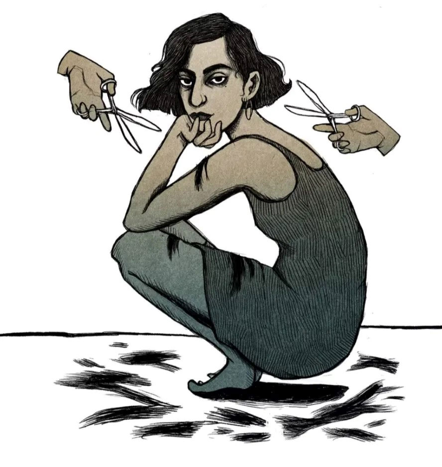 From a young age, Duwaji enjoyed drawing as an emotional expression. In school, teachers would scold her when they caught her scribbling away in her notebooks. She ranks Ronan Bouroullec, Carson Ellis, Lucian Freud, Ashley Lukashevsky, Rithika Merchant, Rachel Levit Ruiz and Betsy Walton among her graphic influences. Growing up between the Middle East and the United States, Duwaji couldn't always relate to either of the cultures. She didn't feel 100 percent Syrian, Emirati or American. Interviewed by Isabella Pearce and Hannah Robathan (Shado, 24 May 2019), she said that she couldn't speak Arabic very fluently and her "western" ideas sometimes clashed with people. But in the USA, her ethnicity also made her an outsider. Western beauty standards sometimes made her feel abnormal. Coping with depression and anxiety, she felt it was difficult finding a therapist who could understand her very specific viewpoint. In Middle Eastern communities, discussing mental health was even more taboo than in the West, so she used her artwork as an outlet for her emotions, but also to show other people in her situation that they are not alone.