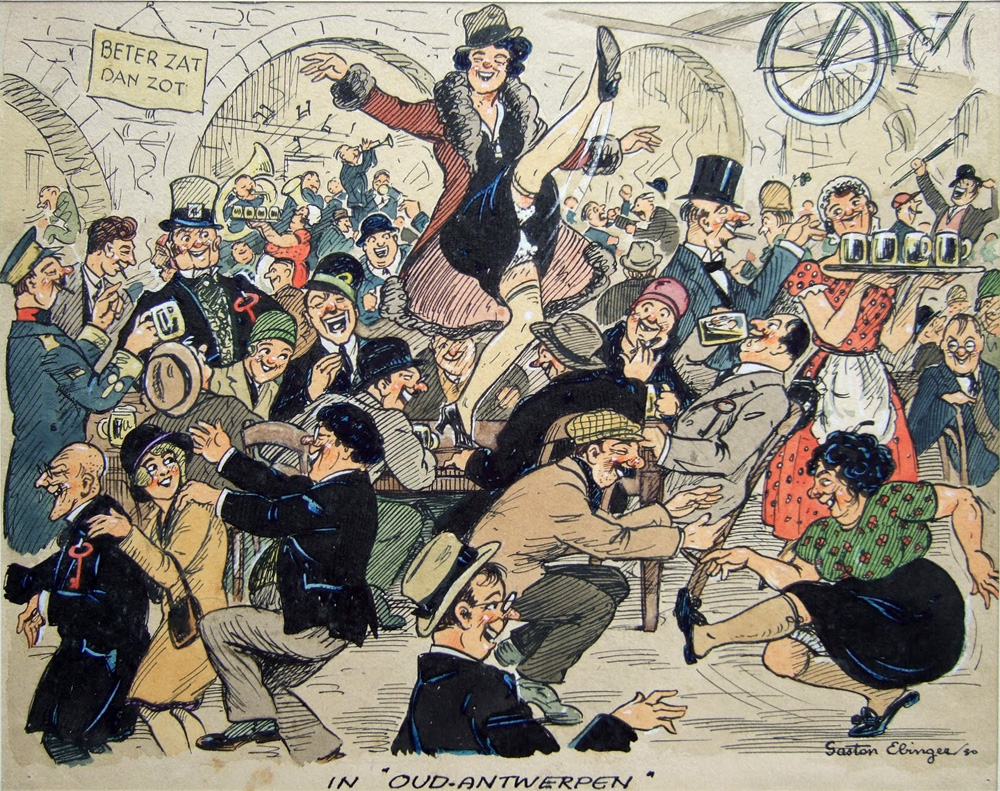 After the war, the family returned to Belgium, where 17-year old Ebinger continued his art studies at the Academy of Antwerp. He became a close friend of Albert Van Dyck, who later became a well-known painter. After graduation in 1922, Ebinger fulfilled his military service and married Gabriella Hansen on 27 August 1923. They stayed together for half a century until his death. Ebinger worked as an advertising illustrator in the suburban neighborhood Kiel, outside Antwerp. He made many illustrations for companies like General Motors, Imperial, Chevrolet, Fort, Parein, De Beukelaer and De Meli. Many of his designs also appeared on plates and cookie boxes. In 1940, World War II broke out and Ebinger was called back into military service. While stationed in Brittany (Bretagne) in Northern France, he made journalistic drawings of the chaotic events and war atrocities. When Belgium surrendered, Ebinger returned to Antwerp, where he earned his bread during the Nazi occupation by illustrating books, newspapers and magazines, including the magazine Ons Land. In 1945, a V2 bomb destroyed most of the Berendrechtsstraat in Kiel, including his house. Luckily both he and his family survived.