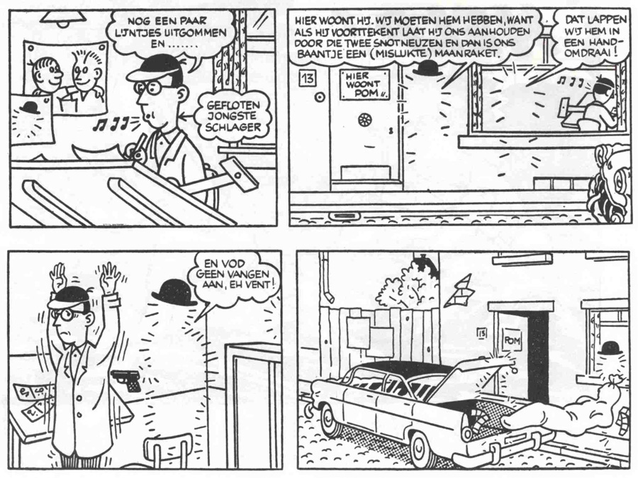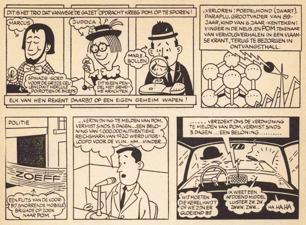 While the illusion fooled enough readers, Pom was understandably not too happy about this solution. On 6 September 1958, 'Intermezzo voor Detectives' was abruptly interrupted without even a satisfying conclusion. Pom made a small two-strip comic in which he staunchly claimed that he was "NEVER abducted" (in capital letters in case anybody thought otherwise), thereby obliterating all goodwill efforts of both Ebinger and his editors. He came up with his own explanation and stated that he had merely "lost his thread" halfway through the story. While "his wife looked for it", he took a "sunny vacation". In typical sarcastic fashion he then depicted himself in rainy weather and walking in puddles in the street, mentioning that "the town refuses to do anything about the holes in the road". The cynical cartoonist then promised his readers that he was now "as fit as a flat tire" to restart his story "De Stralende whatchamacallit" again.
