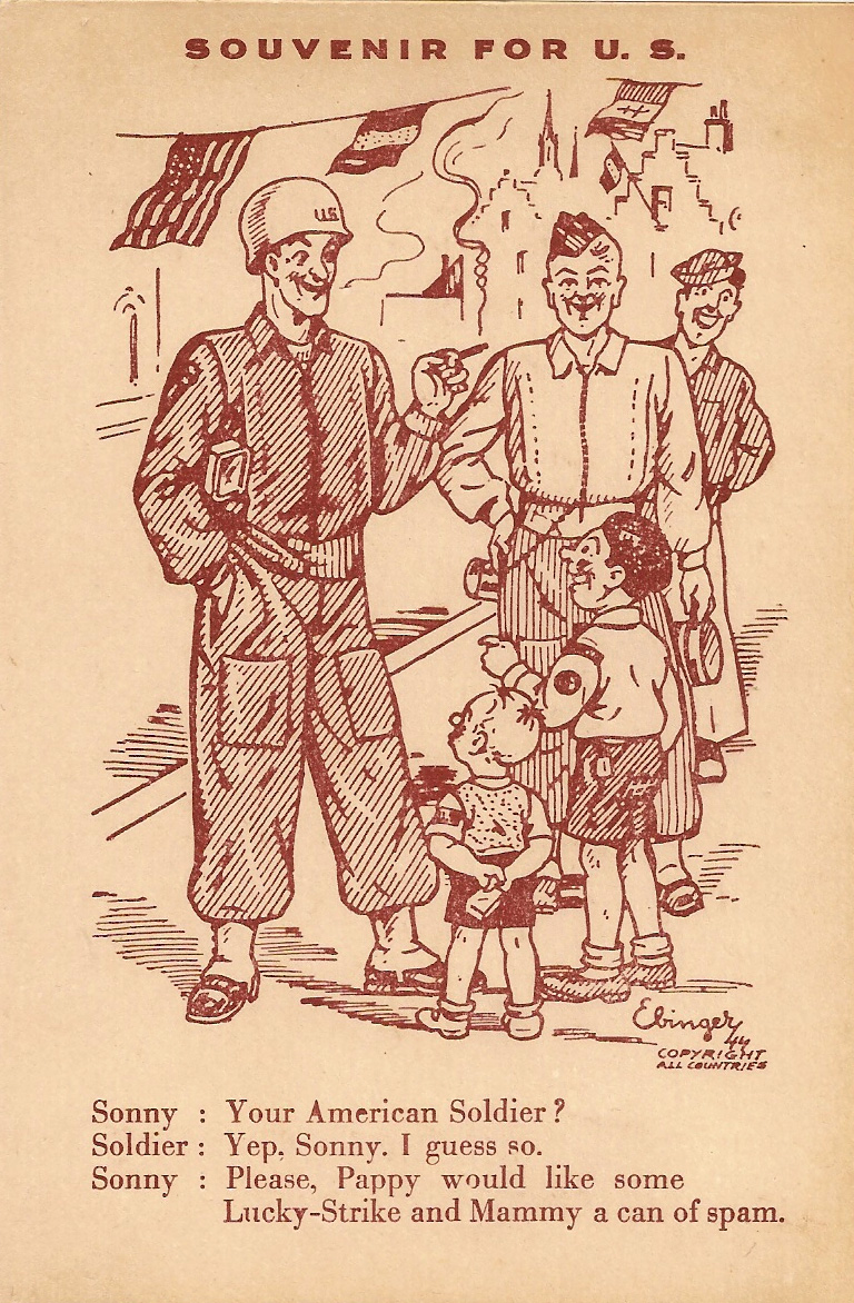 Ebinger was perhaps best recognized to general audiences as a greeting card designer. For the "Provinciale Commissie voor Kunstambachten en -Industrieën" ("Provincial Commission for Art Crafts and Industries"), he designed postcards depicting Antwerp city life. During the World Exhibition in Antwerp (1930), he made picturesque crowd drawings of people having fun at this event. After the Expo they were sold as souvenirs. When Belgium was liberated from the Nazis in 1944, Ebinger created several postcards about the happy event. They depicted U.S., Canadian and/or British soldiers in comedic situations, or mocked Hitler and his unavoidable defeat. Funny dialogue was written in English underneath each image, since the cards were intended as souvenirs for Allied soldiers. They were available in black-and-white as well as color, the latter ones a bit more expensive. The initiative sold well among the target audience. Between 1945 and 1948, Ebinger also drew humorous cartoons about the post-war circumstances, often with cameos of Antwerp mayor Camille Huysmans. They were sold as Christmas and New Year cards and/or posters. Ebinger kept making holiday season cards on an annual basis until the 1960s.