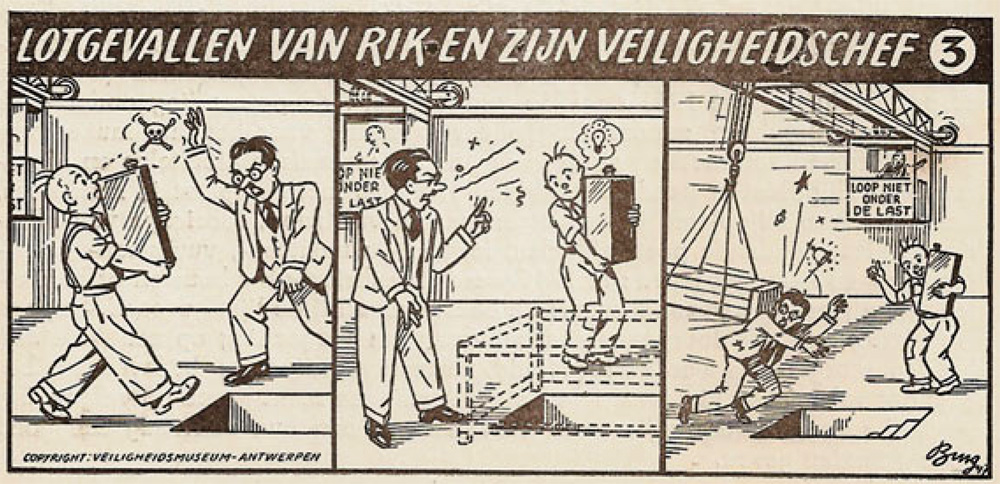 During the 1940s, Ebinger worked for the Veiligheidsmuseum in Antwerp in the Kolveniersstraat nr. 16 (since 1954 located in the Jezusstraat 28 under the current name "Provinciaal Veiligheidsinstituut"). The museum and its institute were preoccupied with instruction guides regarding safety measures. Ebinger designed posters for the museum and illustrated its booklets. Between 1947 and 1955, the institute published its own magazine, Doe Het Veilig, with Ebinger as main illustrator. These illustrations were mostly cartoons and little comics to warn people what would happen if they neglected certain precautions and procedures. The magazine ran a three-page pantomime comic series by Ebinger titled 'De Lotgevallen van Rik en zijn Veiligheidschef'. The comic strip features a dumb worker, Rik, and his only slightly brighter safety chief. Usually Rik does something wrong in the first panel, which is corrected by his chief in the second panel, only to become the victim of an unforeseen accident in the final panel.